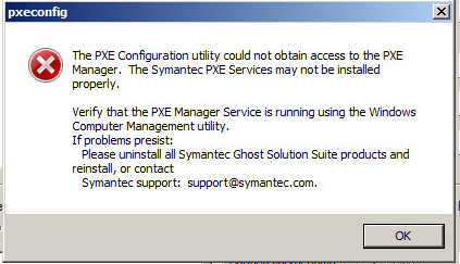 "The PXE Configuration utility could not obtain access to the PXE Manager. the Symantec PXE Services may not be install properly."