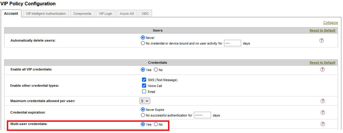 If Multi-user credentials is set to Yes, VIP credentials can be assigned to one or more users.