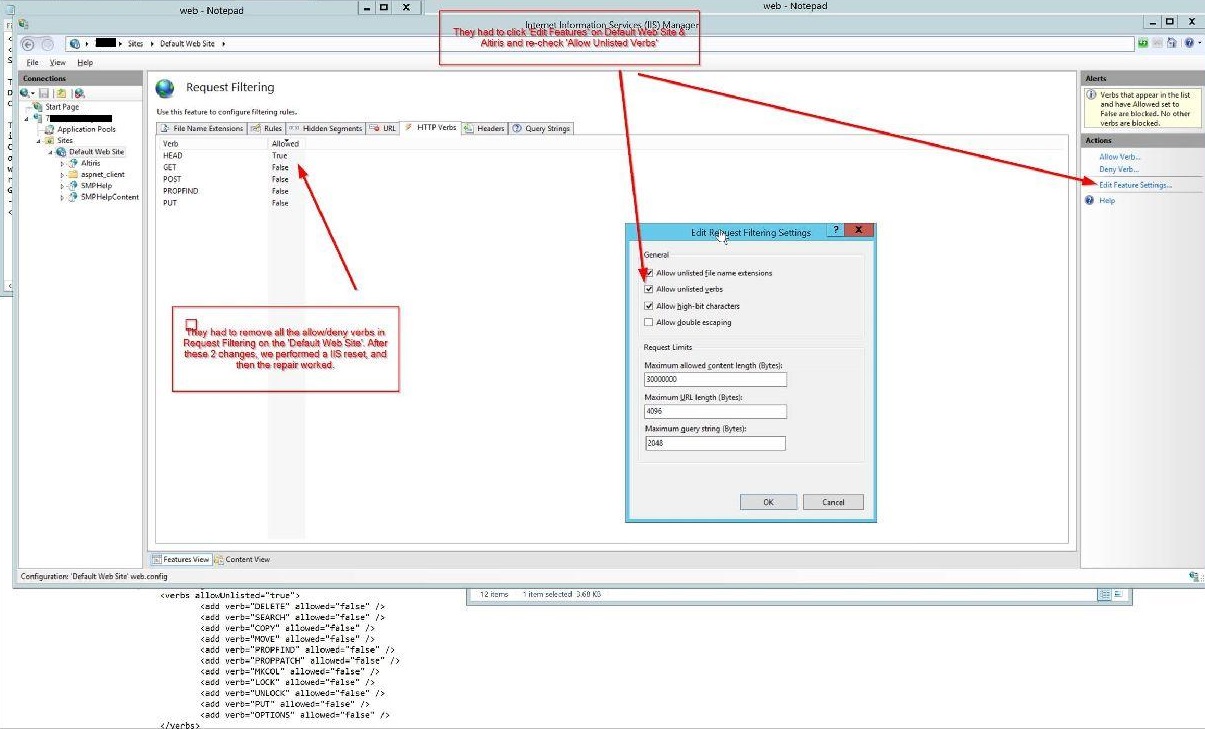 The 'HTTP Verbs' under 'Request Filtering' were only listed on the ‘Default Web Site’, and the ‘allow unlisted verbs’ checkbox was unchecked on both Altiris and ‘Default Web Site’. This is all a result of the Nessus security product performing remediation of what it perceives to be vulnerabilities.
