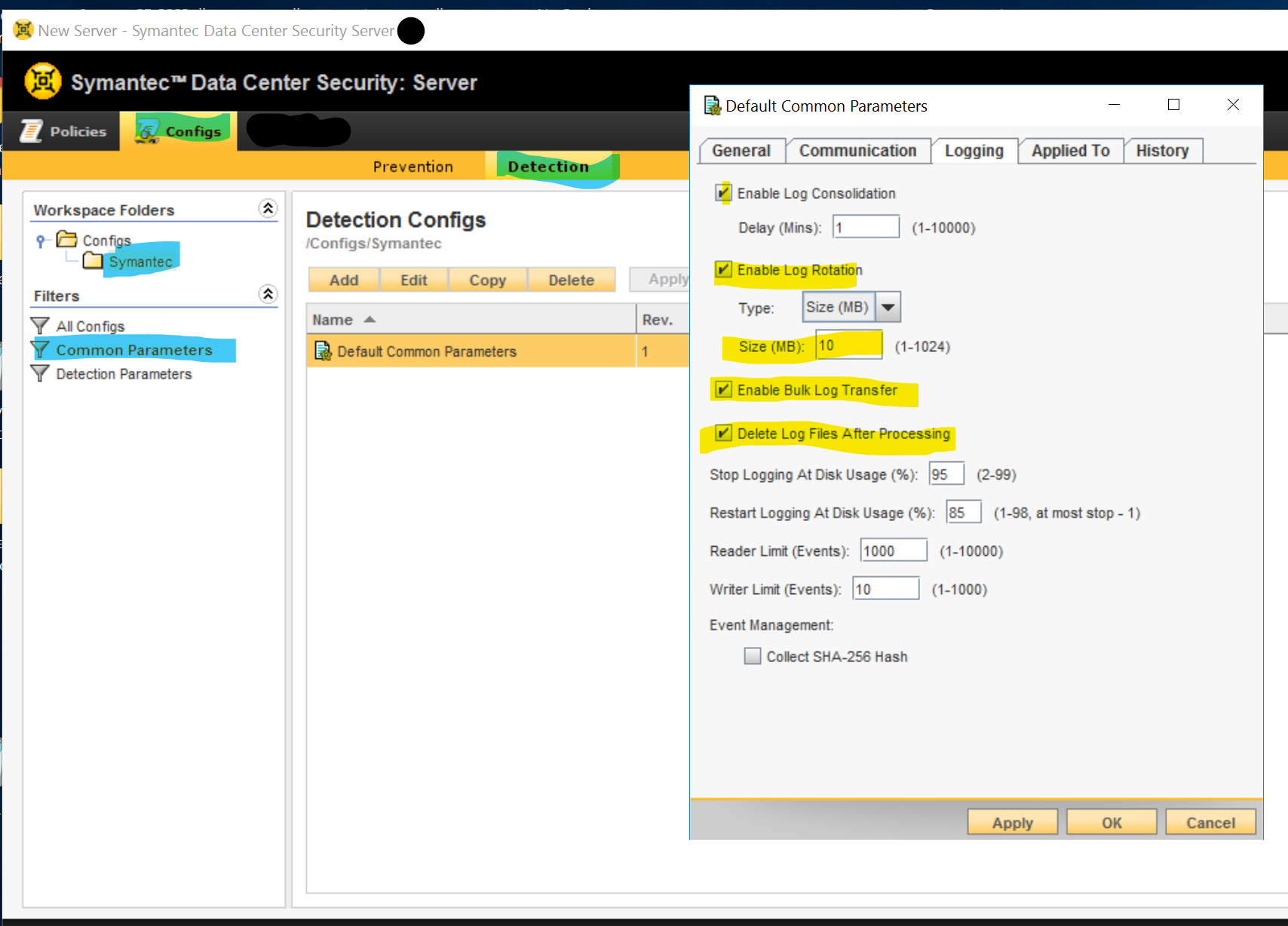 You would like to know the technical details on the Bulk Log transfer feature in Symantec Data Center Security (DCS) common detection parameters.