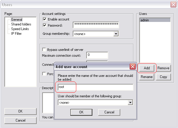 On Shared folders, select the created username and click Add Shared Folders. Browse to a local directory (for example, D:\).