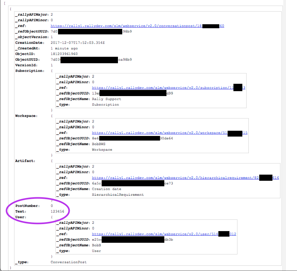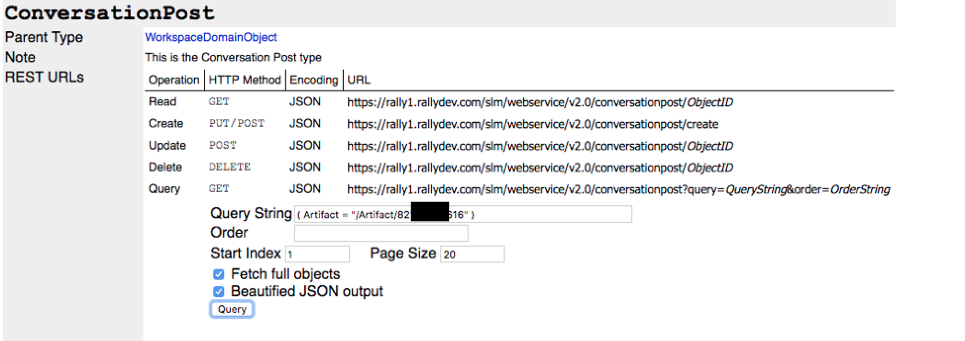 2. From the ConversationPost object in the help pages (Developers > Web Services API) https://rally1.rallydev.com/slm/doc/webservice/ insert a query in the query string entry box in form of ( Artifact = "/Artifact/<OBJECT_OID>" )