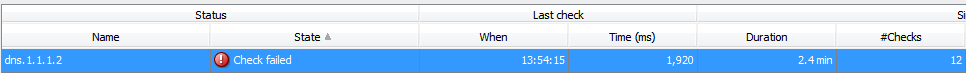 If you go to the advanced URL listed below it will display the statictics of all your services: https://proxyip:8082/health_check/statistics At this point we are looking into the failed services: DNS Server dns.1.1.1.2 Enabled Check failed DOWN Last status: DNS lookup failed. Successes (total): 0 (last): Never (consecutive): 0 Failures (total): 8 (last): Wed, 24 Jul 2013 16:03:19 GMT (consecutive): 8 (external): 0 Last response time: 1893 ms Average response time: 2065 ms Minimum response time: 1893 ms Maximum response time: 2706 ms
