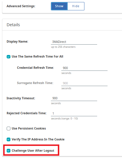 Go to Edge SWG Management Console > Configuration tab > Compact View > Authentication > Realms and Domains > Select an IWA realm > Edit > Advanced Settings > Show > Uncheck 'Challenge User After Logout' >  Apply > Save > Save Changes > Close