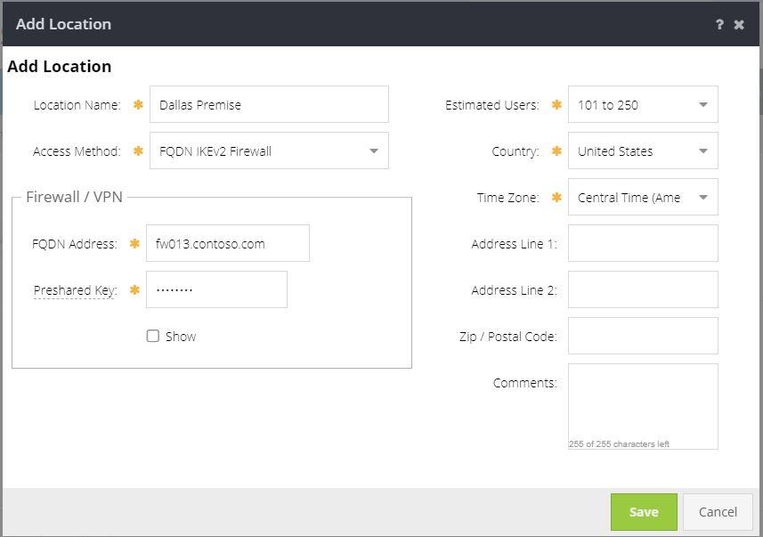 When creating an IPsec location for the Web Security Service, FQDN were not supported until February 2018, and you could not configure a firewall/router device to use an FQDN instead of an IP address. As of March 2018, FQDN are an available option when using Firewalls and Routers that support this feature.