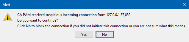 Clicking either Yes or No to allow or block the incoming connection will not affect your session, but we suggest to press No to prevent any other users from tampering with your CA PAM client session and possibly hijacking a session/connection using the same service you are binding to, unless you are confident that the connection is the result of a workflow you started or is legitimate for another reason.