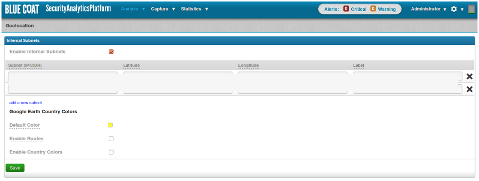 Example: A company has offices in New York, Vancouver, and Tokyo. Their network IPs are 10.0.0.1/16 for New York, 192.168.0.0/16 for Vancouver, and 192.0.2.1/16 for Tokyo. Without setting the internal subnet values, they would all appear at 0,0 on the map. With the Internal Subnets feature, the subnets appear in their proper locations.