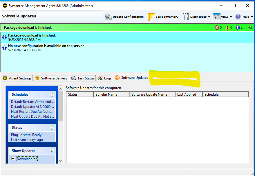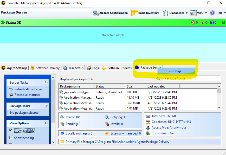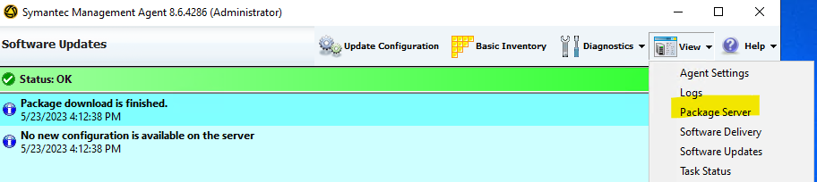 The Package Server tab is closed in the Symantec Management Agent (SMA) UI.
