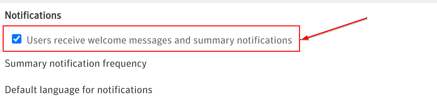 - In the Notifications area, check Users receive welcome messages and summary notifications to enable this feature.
