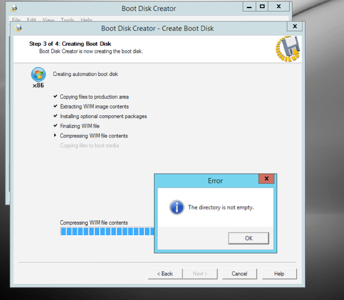 So this message is not necessarily an error. This message does not mean there is a problem with the Boot Disk Creator. It is a message generated by Microsoft and revolves around which build of WinPE 10 that is being used.