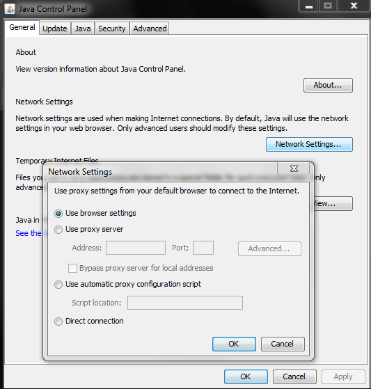 Go to java and go to General -> Network Settings -> and make sure the settings are displayed as below or in Direct connection.