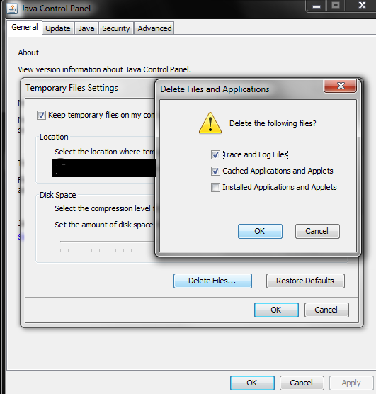 Now clear java cache by going to -> General -> Temporary Internet Files -> Settings -> Delete Files -> Ok