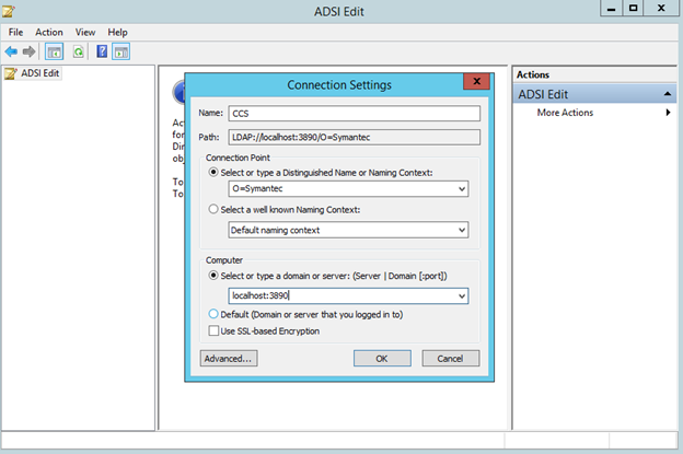 Open ADSIEdit, right-click on "ADSI Edit" click on "Connect to...", and enter a name such as "CCS", for "Connection Point" type "O=Symantec" as the Naming Context and then localhost:3890 as the "Computer", then click "OK" to connect.