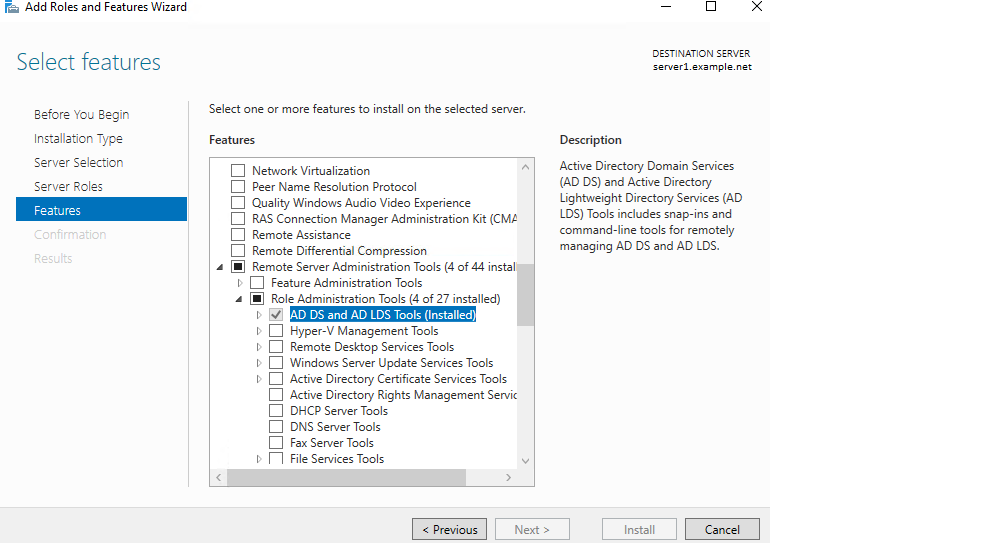 If this utility is not installed we will need to install it via Windows Service Manager -> Manage -> Add Roles and Features. Under "Features" you will expand out "Remote Server Administration Tools" - "Role Administration Tools" and check the box for "AD DS and AD LDS Tools"