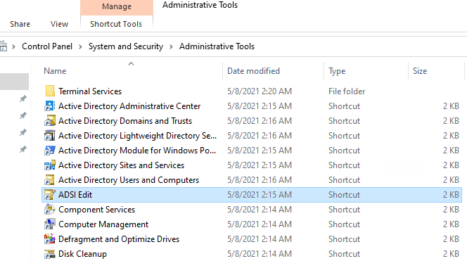 Next, we need to use ADSIEdit, if installed is located at "Control Panel\System and Security\Administrative Tools\"
