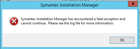 Symantec Installation Manager has encountered a fatal exception and cannot continue. Please see the log file for more information.