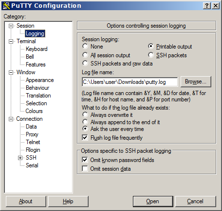 It is possible to save a PCAP in this situation by making use of PuTTY's logging feature. We can display the base64 encoded PCAP at the command line, logging and then converting this output to a wireshark viewable PCAP in Notepad++.