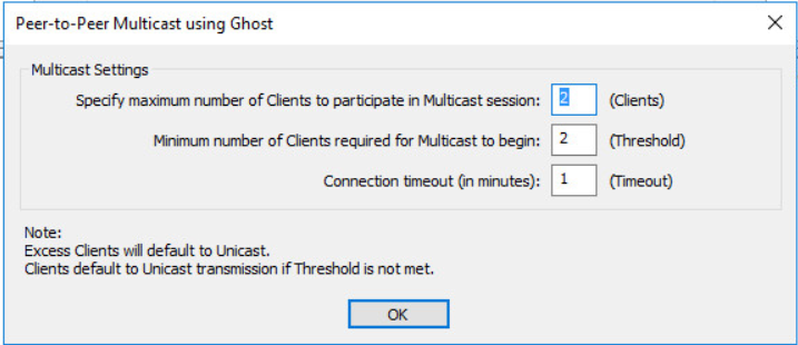 After choosing the Peer-to-Peer Multicast using Ghost option you'll then be given a new pop up box.