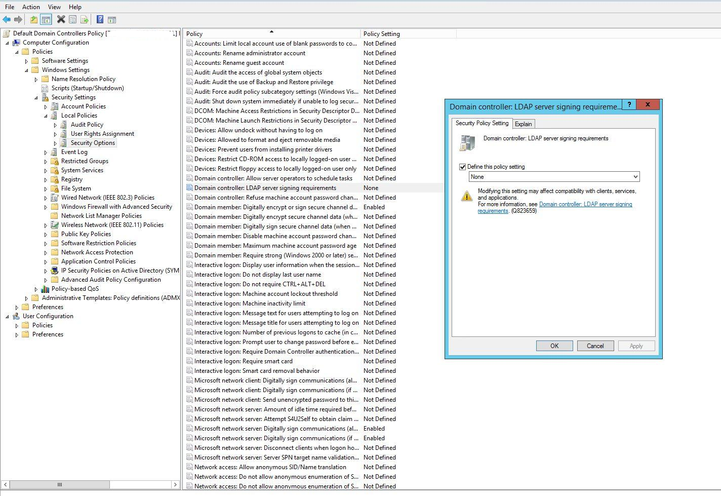 Domain Controller's "LDAP server signing requirements" policy setting is set to require signing, but Active Directory has not been set for accepting SSL connections.