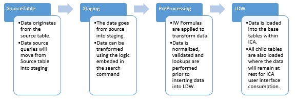 Source data are first queried and stored in staging tables in the RiskFabric database on a schedule defined by the user. The data are next inserted into pre-processing tables corresponding to the entity type defined in import rule mappings. This process takes place during the nightly RiskFabric Processing job and potentially during the RiskFabric Intraday Processing job, depending upon the configuration of the integration. Data are normalized and transformation formulas are applied during this process to ensure the data are prepared for insertion into ICA's core tables. Finally, the data are inserted into the destination Logical Data Warehouse (LDW) tables (also referred to as Core tables) where they will remain at rest. Data in the core tables are queried by the RiskFabric cube and by the ICA user interface.