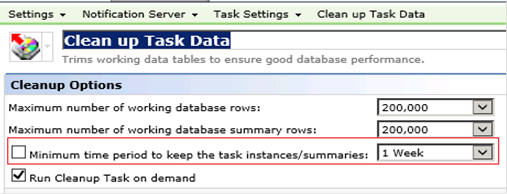 The following settings were used for "Clean Up Task Data" (in the SMP Console under Settings>All settings>Notification Server>Task Settings):