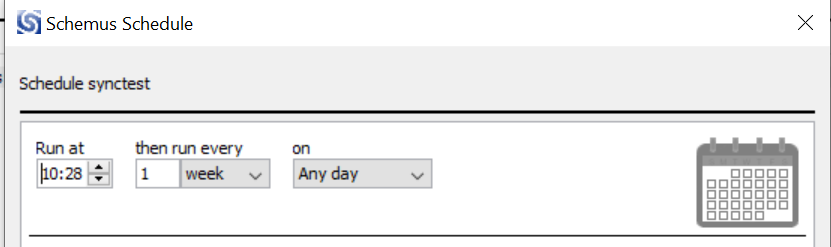 On Microsoft Windows systems, you have the opportunity to enter a user name and password the first time a synchronization is scheduled. You should enter the details of the account under which the application is to run when scheduled. The details are required by the operating system's Task Scheduler and are not retained by the Schemus Synchronizer. If you do not enter the account's details, the scheduled task will be invoked under the local system administrator account, which may not have the required privileges to perform the synchronization. The schedule, including account details, can also be edited from the operating system's Task Scheduler.
