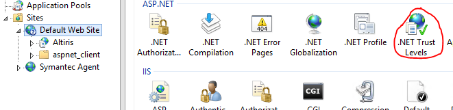 Please check that .NET Trust Levels are set to "FULL" for all Altiris websites/applications under Default Web Site>.NET Trust Levels.
