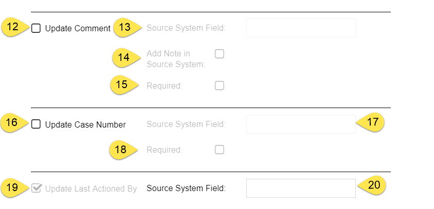 This section controls the remediation actions fields available to the user. These actions include setting the status of an incident, entering a comment, etc. If writeback to Symantec DLP is enabled, this section will also identify the source system field that will be updated in DLP.