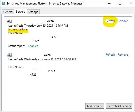 No error message. The Servers Tab is blank. Viewing the ns-support.conf file on the gateway still showed that the servers names.