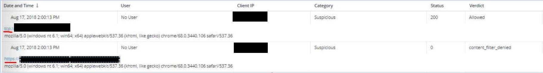 In the report logs, a category which is supposed to be blocked is 'Allowed' with the scheme as 'tcp://'