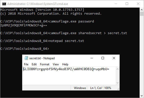 camouflage sharedsecret where "sharedsecret" is the value of the shared secret to be camouflaged. Store both the shared secret and the camouflaged value in a secure location. Alternatively, the shared secret can be piped directly to a file camouflage sharedsecret > secret.txtIn most instances, the shared secret is entered directly in both the VIP Enterprise Gateway configuration console and the configuration file or settings for the integration.