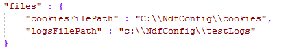 Absolute paths are configured in NdfConfig.json, cookie directories, and log outputs.