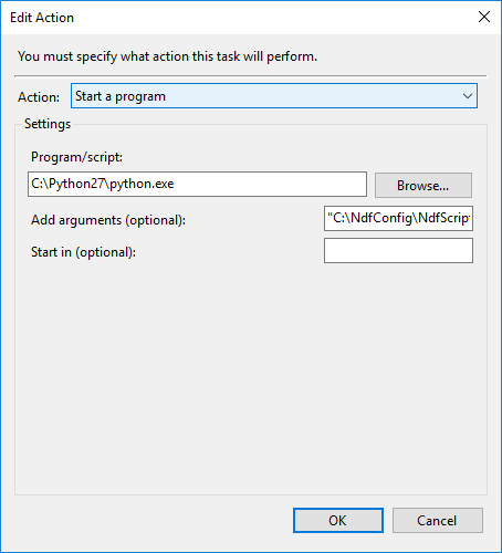 In the `NdfScript.py` file, ensure that the call to the `NdfConfig.json` file includes the absolute path. Edit the Python script `NdfScript.py` to incorporate the absolute path for the corresponding configuration file, `NdfConfig.json`.