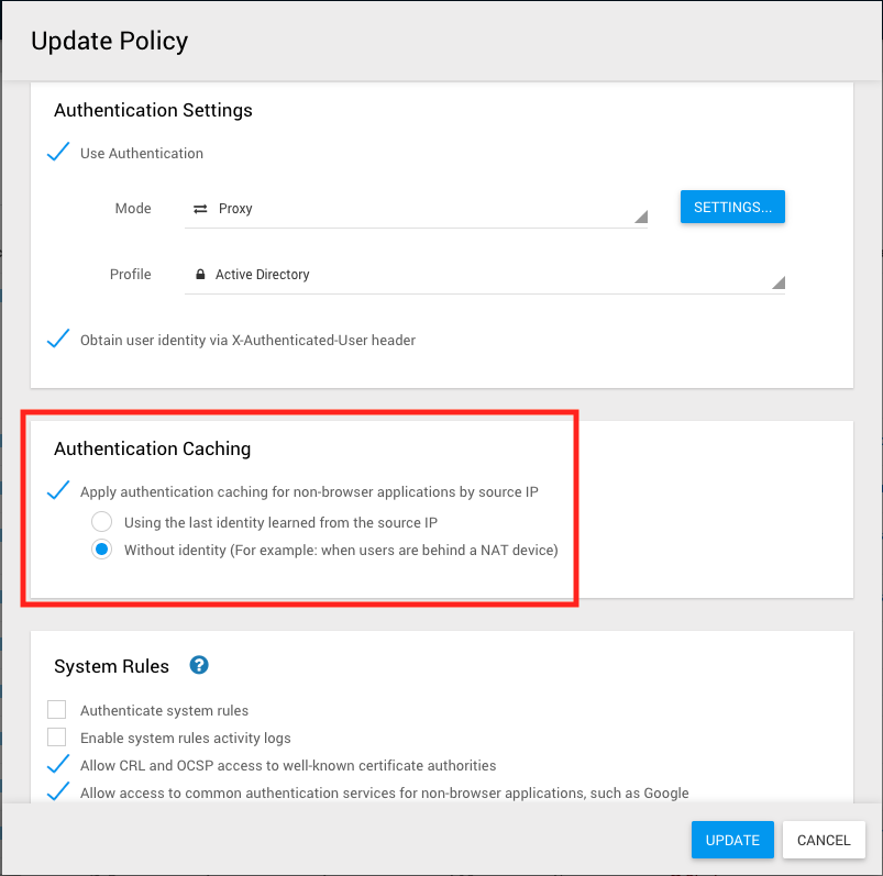 Authentication caching is done according to the settings in the Policy > Authentication Caching tab. The settings selected in the Authentication Caching tab (shown in the image below) determine which of the following settings in System Configuration > Advanced Configuration Settings will be effective: