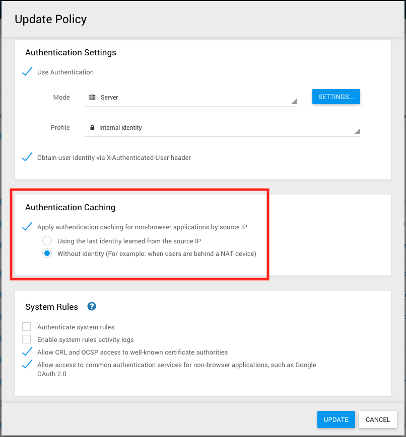 asyncServices.applicationAuthenticationCacheTimeoutSpecificUsername –– Effective when “Using the last identity learned from the source IP” was selected.asyncServices.applicationAuthenticationCacheTimeoutGenericUsername –– Effective when “Without identity (for example, when users are behind a NAT device)” was selected (“Generic User”).