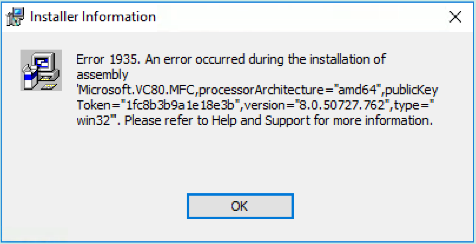 'Microsoft. VC80.MFC,processorArchitecture="amd64",publicKeyToken="1fc8b3b9a1e18e3b",version="8.0.507273.762",type="win32". Please refer to Help and Support for more information.