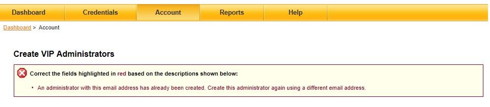 The email address is associated with another VIP account. (E.g., The VIP administrator email exists in a production VIP account and the error occurs when attempting to add the same to a VIP test account). An email address can only be associated with one VIP Manager login at a time.