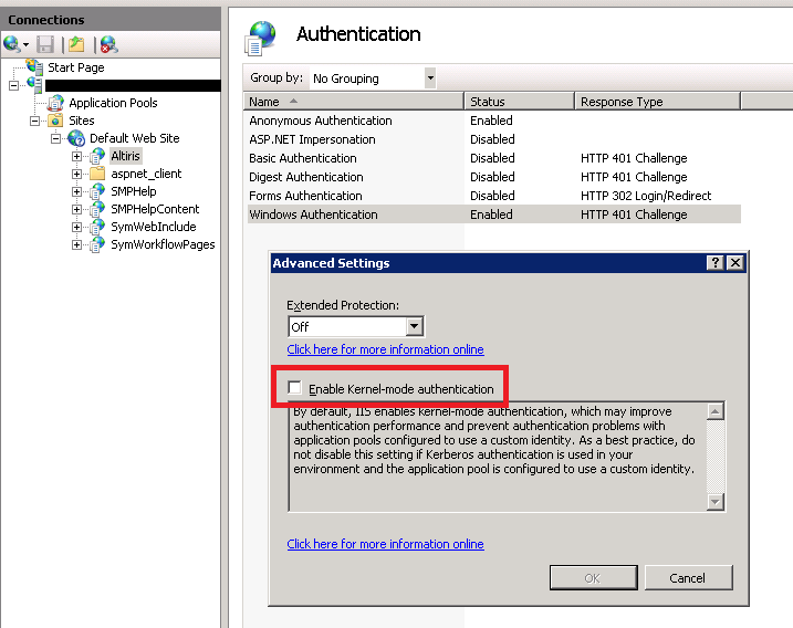 Solution: Disable using kernal-mode authentication on the Symantec Management Platform server: