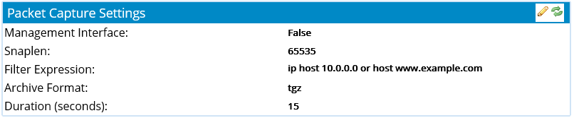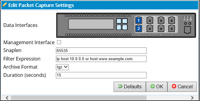 Edit Packet Capture Settings by selecting the interfaces that you would like to perform the capture on, enter the filter expression that you would like to use, and enter the Duration in (seconds) you would like to perform the capture for then click OK.