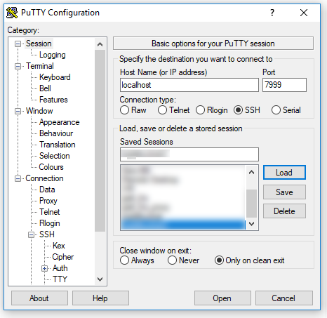 The below configuration is split into two separate sessions. It is done for better modular structure and supportability. The same configuration can be achieved within a single Putty session configuration as well.