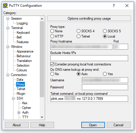 - Telnet command, or local proxy command - plink.exe <External-tunnel-session-name> -nc 127.0.0.1:7999