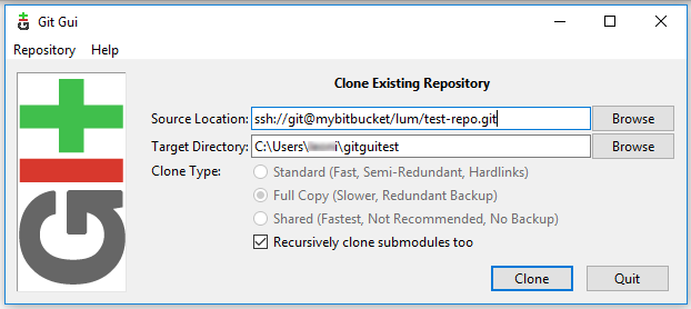 (mybitbucket is the host name of the git server, as defined in .ssh/config and /lum/test-repo.git is the URI of the repository being cloned)