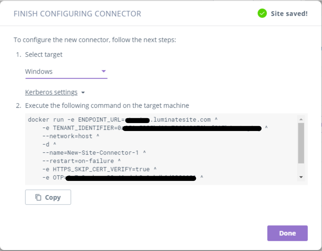 Please copy the content of the text box and run it on the Windows Server, making sure that the session user has permissions to manage Docker containers. The execution of the above command will pull the relevant version of the Luminate Connector from Docker Hub and initialize it, allowing it to reach out to the Luminate Cloud.