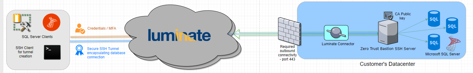 The precondition to accessing Microsoft SQL Server databases with Luminate is an SSH Server (Linux machine or a Docker Container) configured in Luminate Administration Portal (as an SSH Application) that has TCP access to the relevant Database Servers. In order to configure this, please refer to this link.