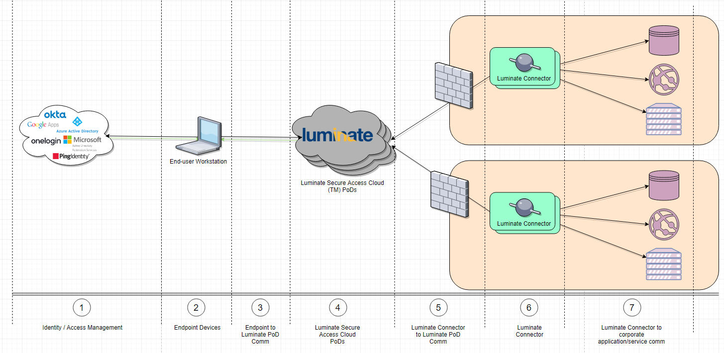 Luminate Connectors are lightweight software agents that are deployed in the customer datacenters (physical and virtual). Connectors help implementing network access isolation, required by the Zero Trust Access model, by opening outbound communication channels to Luminate Secure Access Cloud PoDs and brokering the requests from accessing parties to the corporate applications, services and workloads.