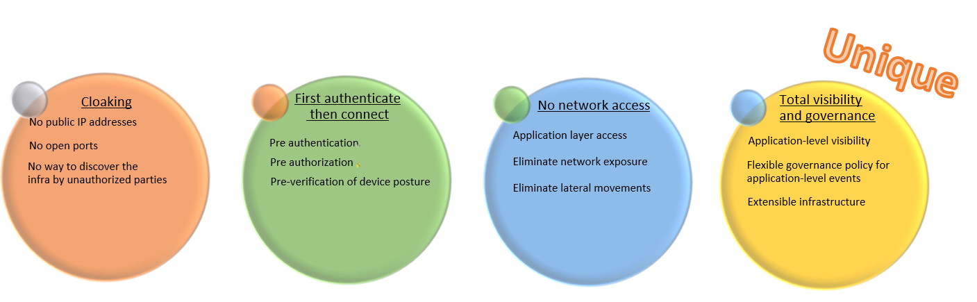 - After being authorized, the accessing party gets only application-level access to the requested resource, never a network access