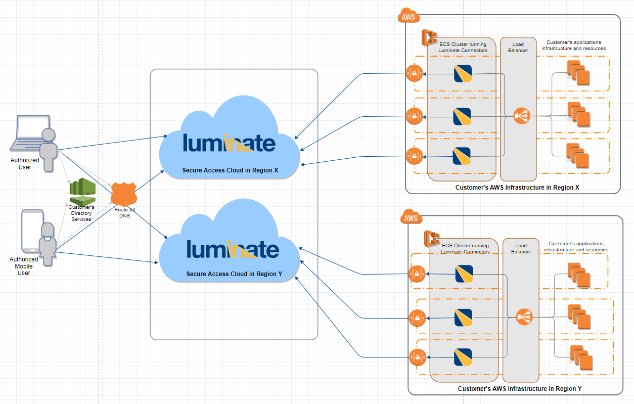 Luminate Secure Access Cloud (TM) serves as a connectivity broker between the "consumers" of corporate IT resources and the actual resources hosted in the AWS. The connectivity is delivered from a highly-distributed fabric, providing points of delivery (PoDs) located in every AWS Region, close to the resources that are being served.