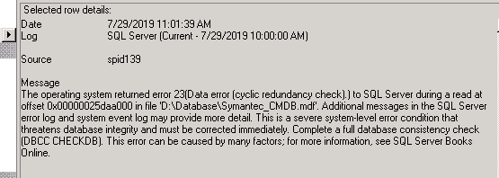 The operating system returned error 23(Data error (cyclic redundancy check).) to SQL Server during a read at offset 0x00000025daa000 in file ‘D:\Database\Symantec_CMDB.mdf’. Additional messages in the SQL Server error log and system event log may provide ore detail. This is a severe system-level error condition that threatens database integrity and must be corrected immediately. Complete a full database consistency check (DBCC CHECKDB). This error can be caused by many factors; for more information, see SQL Server Books Online.