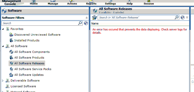 When attempting to access “Manage > Software > All Software Releases” and error is thrown in the right pane
