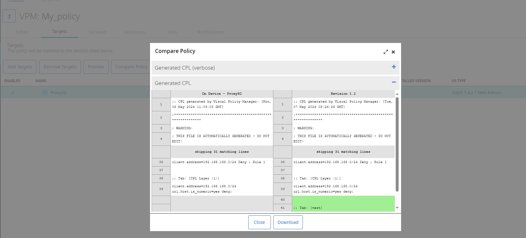 You can compare the policy version installed on the device with the current policy version that is stored in Management Center. This can help you determine if the desired policy version is installed on the device.